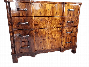 Rarissimo Comò Art Déco di Scuola Veneziana con esplicite tendenze al Barocchetto Veneziano. Interamente in Radica di Noce Biondo di prima scelta. Guardare le foto. Mobili di esplicito Design e Tendenza. Restaurato a gommalacca secondo i criteri d'epoca dei maestri ebanisti Veneziani ed in condizioni eccellenti.