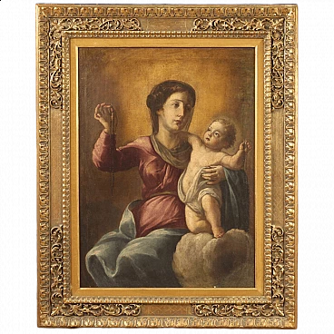 Antico dipinto italiano della prima metà del '700. Opera olio su tela raffigurante soggetto religioso: Madonna con bambino. Quadro adornato da cornice del '900 scolpita, dorata e completa di passe-partout in velluto e legno. Dipinto di buona luminosità, particolare la Madonna e Gesù raffigurati con rosario tra le dita, per antiquari e collezionisti. Quadro che ha subito un intervento di restauro conservativo, rintelo, sostituzione del telaio e ripresa del colore in alcuni punti. Dipinto in buone condizioni con qualche segno del restauro. Luce dipinto H 81 x L 59 cm.