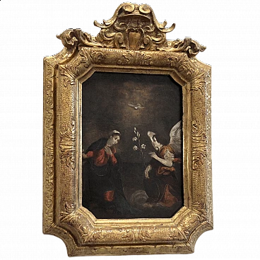 Annunciazione, dipinto olio su rame del '600. L'opera è decorata con una cornice dorata in stile Luigi XV del '700. E' in ottime condizioni e comprende un certificato di autenticità. Misure completo di cornice: 39 cm x 27 cm. Misure solo dipinto: 22,5 cm x 17 cm.