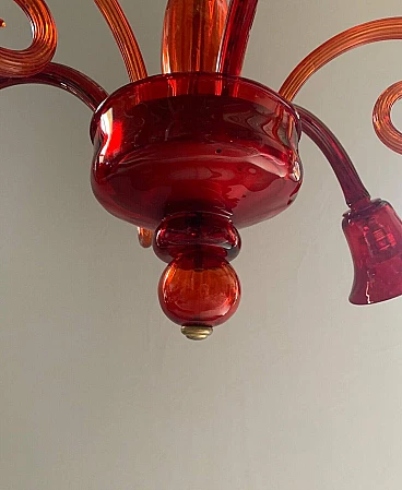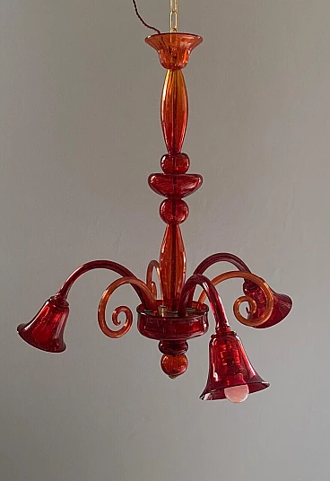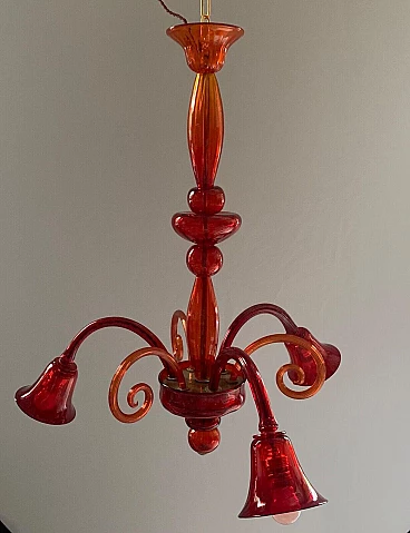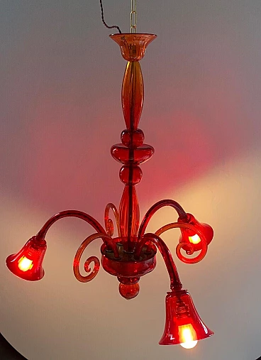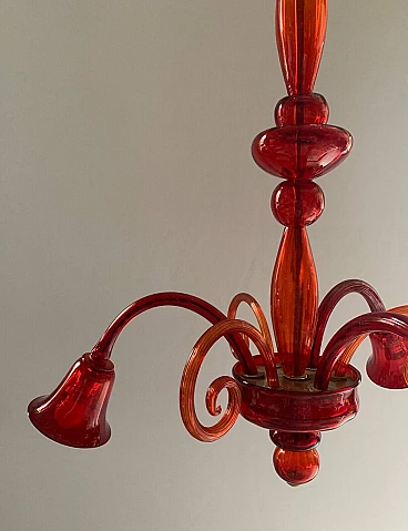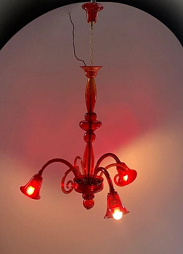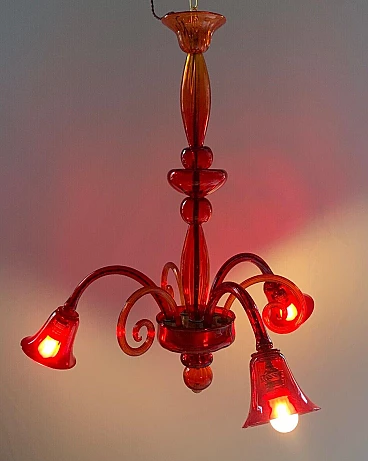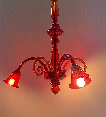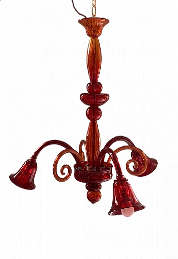 Lampadario a 3 luci in vetro di Murano rosso, anni '40