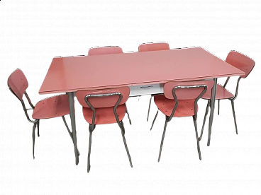 Set composto da un tavolo e 6 sedie in formica. In discrete condizioni con segni d’uso, Il cassetto è stato restaurato. Il colore originale è sbiadito. Piccolo foro nella parte anteriore del tavolo. Le sedie misurano 39x41 h78/43