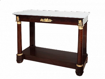 Consolle Impero Francese in piuma di mogano con innesti di elementi in bronzo dorato finemente cesellato. Il piano in marmo grigio bardiglio è retta da una fascia sottopiano contenente un cassetto con al centro un fregio in bronzo raffigurante scena allegorica. Due belle colonne interamente piumate terminano con base e capitello in bronzo dorato finemente cesellato. Provenienza: Francia XIX secolo. Misure: 114x44 H96cm. Documento: Certificato di Autenticità.