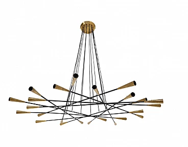 Lampadario Shangai in ottone di manifattura italiana. Il lampadario è costituito da una coppa in ottone che lo collega al soffitto alla quale sono collegati dei fili che sostengono il lampadario. Il corpo è costituito da aste in ottone verniciato nero incrociate tra loro che creano un effetto Shangai, da cui il lampadario prende il nome. Sono presenti 24 paralumi in ottone dorato ognuno dei quali ospita una singola luce.