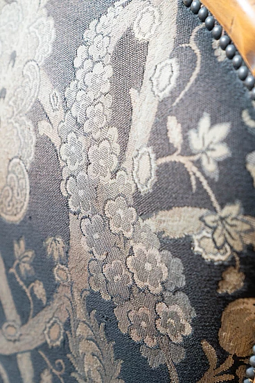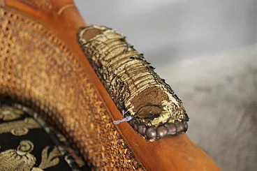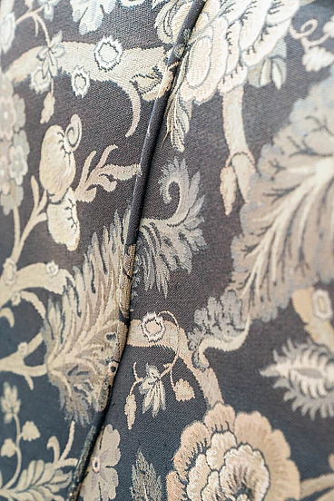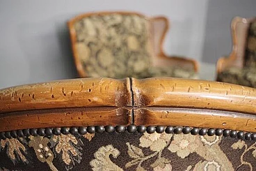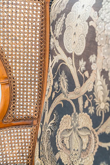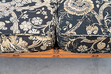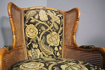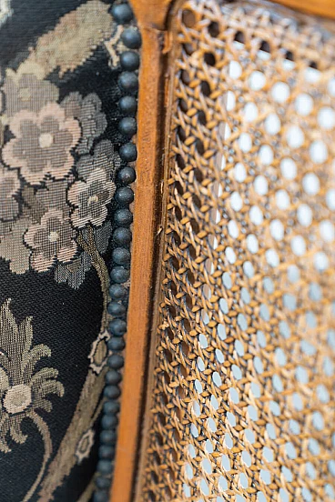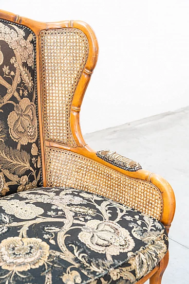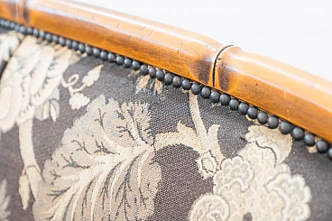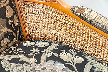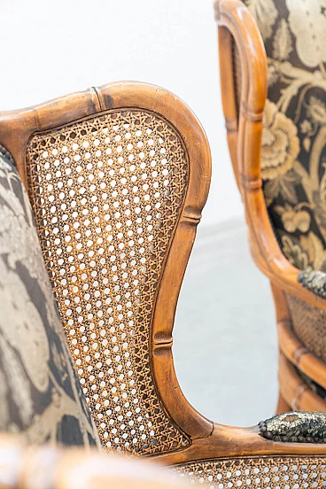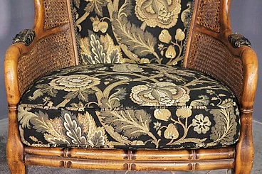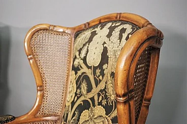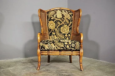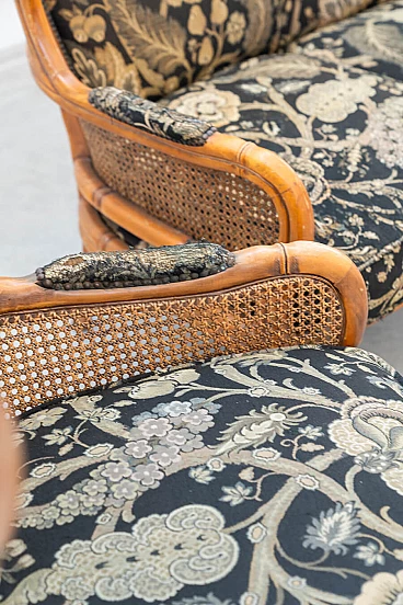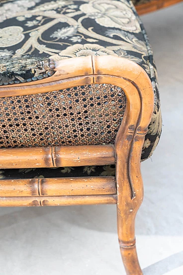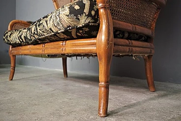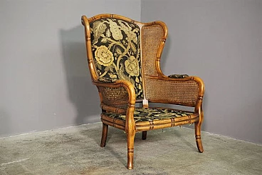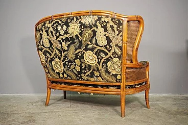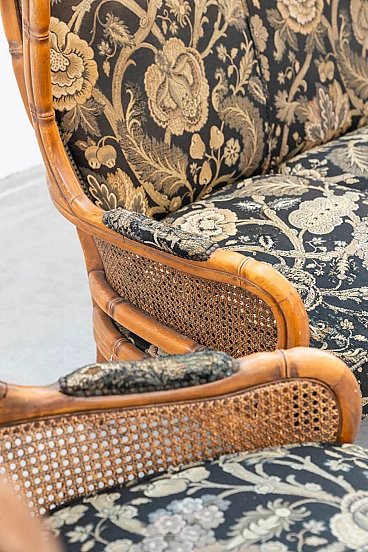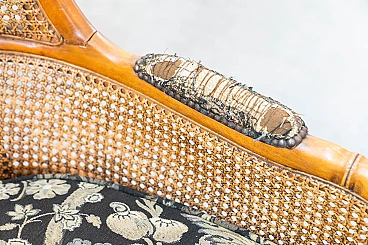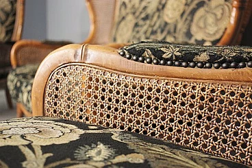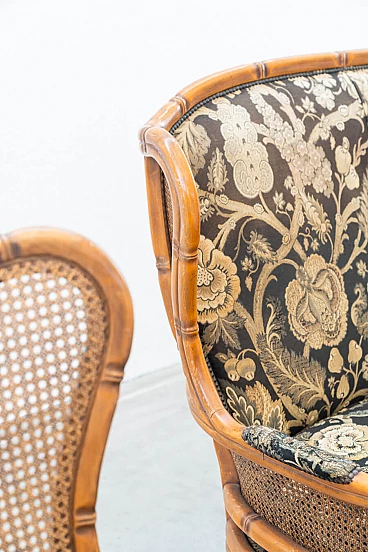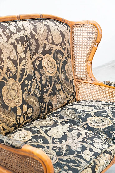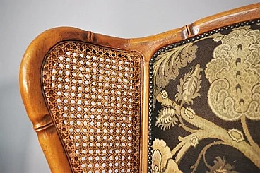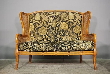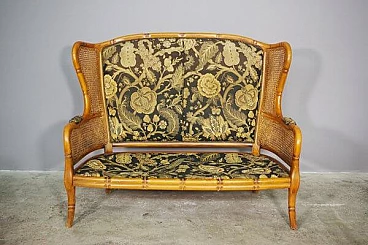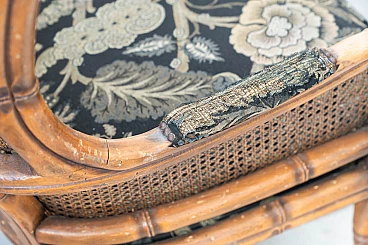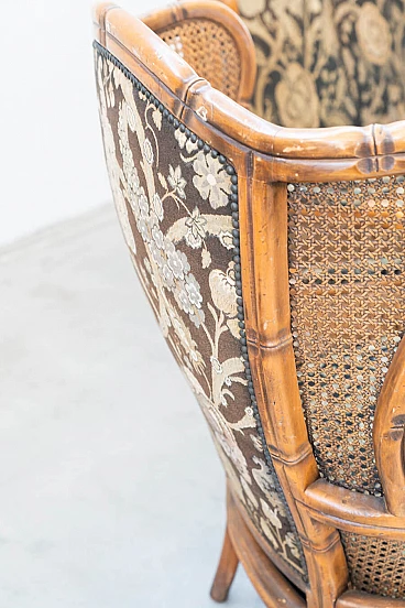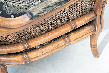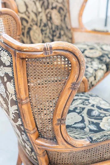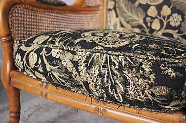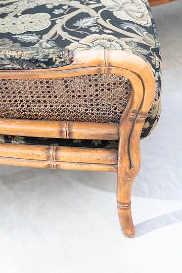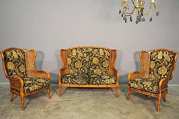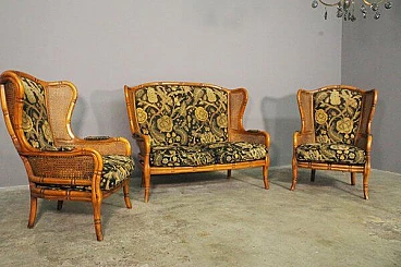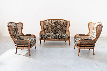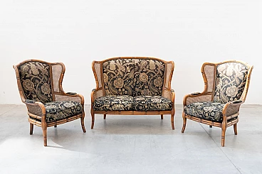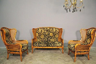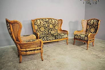 Divano e coppia di poltrone in bambù, vimini e tessuto, anni '80
