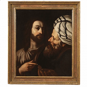 Olio su tela Cristo della moneta con cornice lignea, '600
