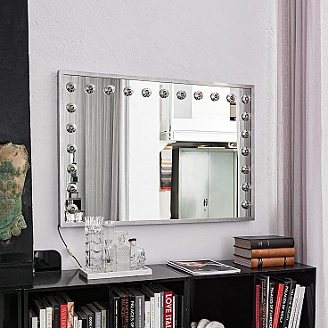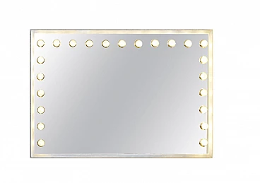 Specchio da toeletta in alluminio con luci, probabilmente anni '70. Dotato di 23 luci montate su tre lati. È molto grande e conservato in ottime condizioni. Si tratta di un complemento molto bello e originale per qualsiasi tipo di spazio, dal bagno al soggiorno o alla camera da letto. Può farti sentire una star del cinema o può far emergere il make-up artist nascosto in te. Oltre alla sua funzione principale di specchio da toeletta, le sue numerose luci sono ideali per illuminare una stanza e le sue dimensioni lo rendono uno specchio da parete perfetto che si adatta anche a stanze molto grandi. Tutte le 23 lampadine sono state sostituite con moderne lampade a LED ad alta efficienza, molto luminose e calde. I cavi originali sono stati sostituiti da un elettricista professionista con l'utilizzo di un interruttore d'epoca per mantenere l'aspetto più fedele possibile all'originale. È conservato in ottime condizioni generali con solo alcuni segni minori vicino ai bordi del vetro, un leggero sbiadimento sulle prese cromate e una patina leggera e uniforme sulla cornice in alluminio spazzolato.