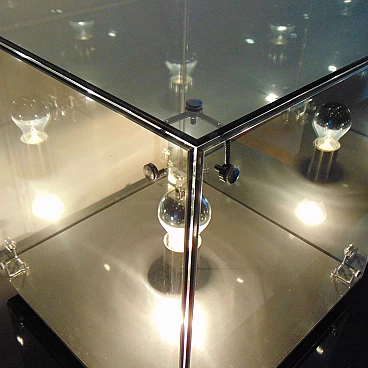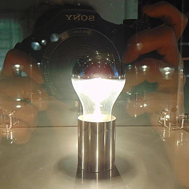 Quando è spenta, è uno specchio a cinque lati, da accesa, diventa una seducente lampada scultorea. Bulbo a calotta argentata.