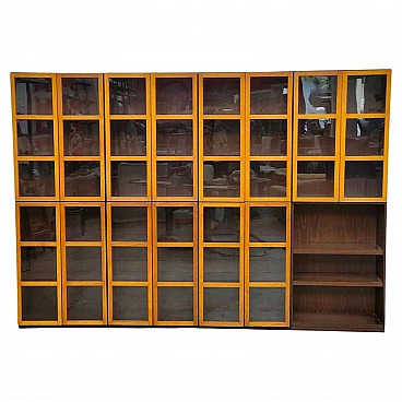 "Book" è la libreria preferita da architetti e designer di tutto il mondo. È un progetto nato molti anni fa, ma ancora oggi capace di esprimere un modo nuovo e libero di comporre una parete. Ha elementi di seduzione, un giusto equilibrio tra estetica e funzionalità, una linearità, una duttilità, che non fanno sentire il passare del tempo. "Book" è un sistema modulare di contenitori chiusi e ripiani a poro aperto ed è una perla di design concepita da Titti Fabiani per IFT (Ideal for Team) nel fermento creativo della Milano di fine anni '60. La libreria è composta da quattro elementi affiancabili in noce biondo; tre moduli sono dotati di quattro ante battenti in vetro trasparente e un quarto diviso a metà tra ante in vetro e ripiani a vista. La struttura è realizzata in essenza di frassino tinto a poro aperto. Anche gli elementi "Book" sono dotati di una base sempre in frassino. La sua modularità permette la composizione dell'intera parete o in frazioni separate e si adatta a spazi ed esigenze diverse. Dimensioni di ogni singolo modulo: altezza 196 cm larghezza 70 cm profondità 37 cm
