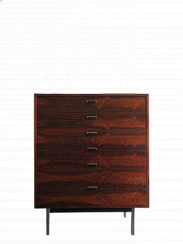 Cassettiera in palissandro disegnata da Jack Cartwright e prodotta da Founders Furniture, gambe in metallo cromato e maniglie in metallo verniciato, USA anni 60.