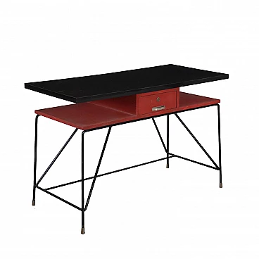 Scrivania con piano in legno ricoperto in formica, metallo smaltato e puntali in ottone. Cassetto presente nel sotto piano.