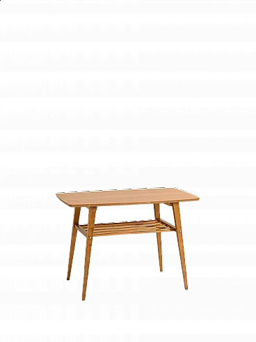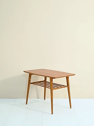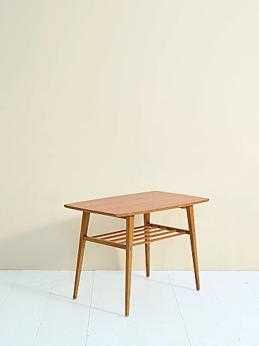 Tavolino vintage con ripiano portariviste. Le linee pulite e minimali ricalcano la tradizione nordica che vuole unire estetica e funzionalità. Questo tavolino, dalle dimensioni contenute, può essere utilizzato come comodino e grazie alla presenza di un secondo ripiano è adatto per essere utilizzato come portariviste. Buone condizioni: il mobile è stato riportato al suo splendore originale attraverso un restauro conservativo con prodotti di origine naturale, può presentare dei segni del tempo. Per favore guarda i dettagli nelle fotografie!