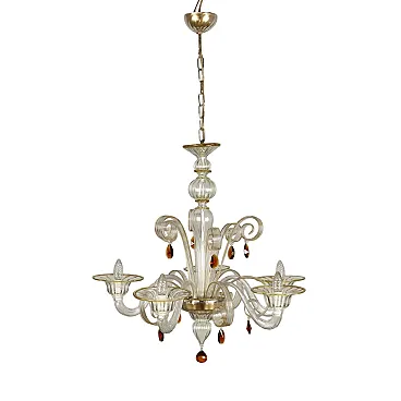 Lampadario Pastorale in vetro di Murano a 5 luci con pendenti in vetro colorato. Marchio della manifattura inciso nel vetro.