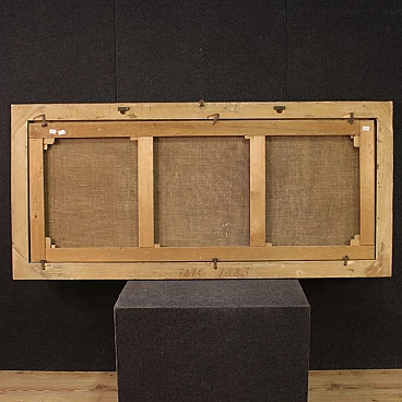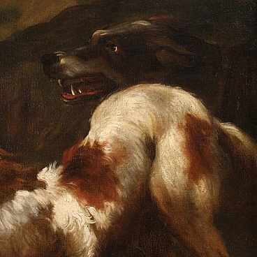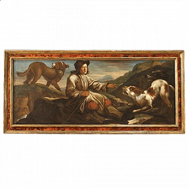 Antico quadro lombardo del XVII secolo. Dipinto ad olio su tela di notevoli dimensioni raffigurante un pastore con i suoi cani immersi in un paesaggio di campagna. Opera di grande qualità pittorica, è notevole la maestria con la quale il pittore ha rappresentato gli animali. Cornice non coeva in legno scolpito, laccato e dorato, di bella decorazione. Quadro che ha subito un intervento di restauro conservativo con rintelo, sostituzione del telaio e ripresa del colore in alcuni piccoli punti, nel complesso in ottimo stato conservativo. Luce dipinto H 71 x L 181 cm.