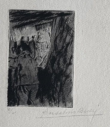 L’incisione fa parte dalla serie Croquis du Front Italien, composta da 50 puntesecche in cui Bucci rappresenta scene del fronte italiano nella Prima Guerra Mondiale. Attraverso un tratto nervoso e vivace, dato dalla tecnica della puntasecca, l’osservatore viene catapultato tra i soldati all’interno di una trincea. I giochi chiaroscurali sono forti e caricano la scena di pathos, la composizione è scandita da una zona più scura in primo piano mentre è inondata di luce sullo sfondo. La sequenza degli uomini colti tutti di spalle e i tratti che caratterizzano la loro figura ribadiscono la linea di fuga prospettica. La scelta del punto di osservazione, fortemente prospettico, potrebbe suggerire che l’artista si trovasse realmente in quella posizione e abbia deciso, con rapidità ed intuito, di voler fissare sulla lastrina i tratti essenziali della scena, il chiaroscuro avvolgente. Firma, numerazione 83/100 e titolo in basso a destra a matita En tranchée ouverte.