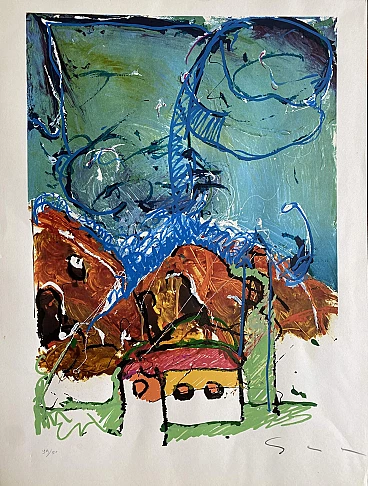 Mario Schifano (Homs 1934 – Roma 1998) La casa, 1980 Serigrafia a colori misure: cm 80 x 60 Pittore, produttore cinematografico e musicista italiano, uno dei massimi rappresentanti del movimento postmoderno. A causa del suo stile di vita sregolato venne soprannominato Artista Maledetto. Nacque nella Libia italiana, ma dopo la guerra si stabilì stabilmente a Roma. Inizialmente seguì le orme paterne lavorando come restauratore presso il museo etrusco di Villa Giulia, fu questo il suo ingresso nel mondo dell’arte. Aderisce inizialmente ai canoni dell’Arte Informale, poi entra a far parte delle cosiddetta Scuola di Piazza del Popolo, un gruppo di artisti e intellettuali che si riuniva al Caffè Rosati per discutere insieme a personaggi come Pasolini, Moravia e Fellini. Già dal 1959 espone in tutto il mondo, ma è il 1962 l’anno importante per la sua carriera artistica perché partecipa alla mostra New Realists presso la Sidney Janis Gallery di New York. Le sue opere sono esposte accanto a quelle di artisti come Andy Warhol (Pittsburgh 1928 – New York 1987) e Roy Lichtenstein (New York 1923 – New York 1997). Da li in poi la pop art diventerà il suo linguaggio, la superficie pittorica non viene considerata nella sua tridimensionalità ma come schermo piatto sul quale far rispecchiare il mondo. Tra gli anni ’70 e ’80 abbandona quasi completamente la pittura e si dedica alla riproduzione serigrafica di immagini. Tema ricorrente nell’opera di Schifano: la rappresentazione della casa immersa nella natura sotto un cielo blu inteso e vicino a catene montuose. L’immagine molto semplice, immediata, ha tuttavia un forte impatto visivo grazie ad accesi accostamenti cromatici che contribuiscono a costruire superfici e volumi. Esemplare firmato e numerato 79/150 a matita nel margine inferiore. Ottimo stato di conservazione.