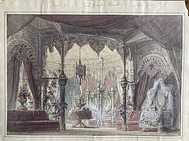 Philippe Chaperon (Parigi 1823 – Lagny-sur-Marne 1906) Boudoir. Le Juif errant Penna, acquerelli e biacca Misure: mm 250 x 355 Pittore e scenografo noto per il suo lavoro presso l’Opera Nazionale di Parigi. Studia Pittura e Architettura a Parigi e vince il Prix de Rome trascorrendo tre anni a Villa Medici. La prima esposizione al Salon è del 1844 con un dipinto di paesaggio indiano d’invenzione. Il paesaggio dal vero o d’invenzione è un genere che Chaperon affronterà lungo tutta la sua carriera e dal quale trarrà ispirazione per la produzione scenografica. Dopo aver collaborato con il famoso studio di scenografia di Pierre Luc Charles Ciceri (1782-1868) fonda nel 1864 con Rubé l’atelier “Rubé et Chaperon” e per i successivi 30 anni produce numerose scenografie e decorazioni per teatri in tutta la Francia e Belgio. Nel 1895 lascia l’atelier ma continua a lavorare per teatri e decorazioni di edifici pubblici e privati. Alla sua morte i tre figli proseguirono l’attività. Moltissimi suoi disegni, conservati nei musei francesi, documentano la sua attività. Il disegno è una scenografia per l’opera Le juif errant: un’opera in cinque atti e otto tableaux di Fromental Halévy, su libretto di Eugène Scribe e Jules-Henri Vernoy de Saint-Georges. Il tema è ispirato al romanzo moraleggiante di Eugéne Sue edito nel 1844. L’opera venne rappresentata a Parigi alla Salle Peletier nel 1852 con scarso successo. Presso la Biblioteque Nationale si conserva una scenografia per il primo atto datata 1879. Benché la vicenda si svolga fra il XII e il XIII secolo il disegno propone un elegante interno riccamente arredato nel gusto dell’epoca di Chaperon stesso. Siamo in una splendida sala dall’architettura orientale, probabilmente nel quarto atto, è l’appartamento di Irene, figlia dell’Imperatore d’Oriente. Il disegno è firmato e datato in basso a sinistra: Ch Chaperon 1867. La data non corrisponde alla prima rappresentazione, evidentemente l’autore deve aver lavorato sul soggetto per un altro teatro. Il disegno è applicato lungo i soli margini a foglio d’album sul quale, in grafia coeva, si trovano le indicazioni: (boudoir) Le juif errant julliet 1867. Ottimo stato di conservazione eccetto una minima mancanza in alto a destra nel foglio di supporto.