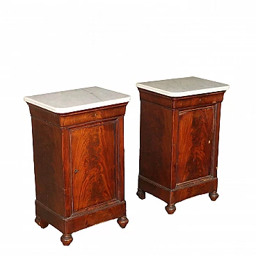 Coppia di comodini Luigi Filippo in mogano con piano in marmo. Sul fronte presentano un'anta e un cassetto, mentre alla base sono sorretti da piedini torniti. Gli interni sono in noce.