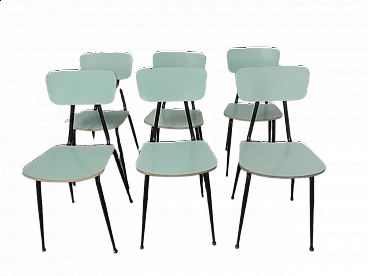 6 Sedie in formica verde con gambe verniciate in nero. Le sedie sono in buone condizioni con piccoli segni d’uso.