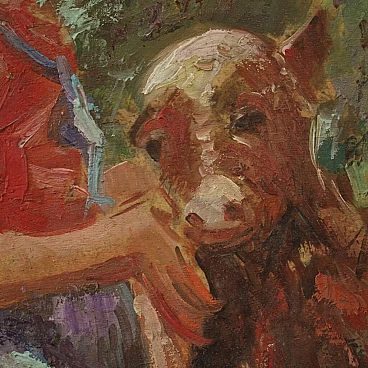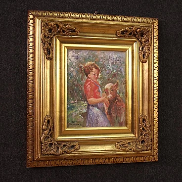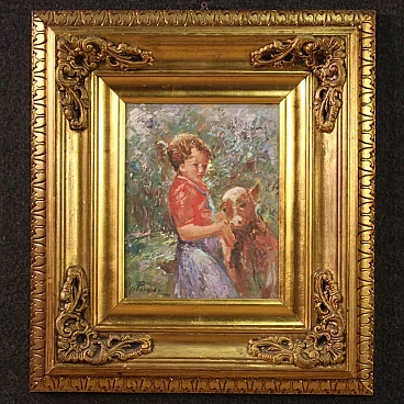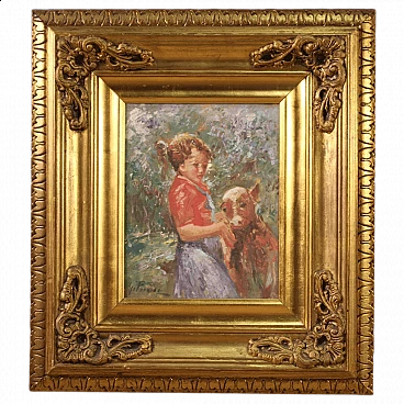 Olio su tavoletta affigurante bambina con vitello, '900