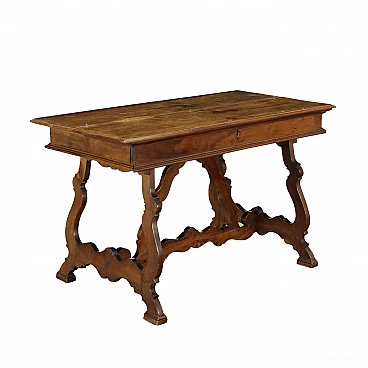 Scrittoio San Filippo in noce e legni antichi, Italia inizio XX secolo. Presenta un piano con anta a ribalta celante scarabattolo a 4 cassetti, gambe, saette e traversa sagomate a lira. Interni in abete. Prodotto che a causa dell'età e dell'usura richiede interventi di restauro e ripresa della lucidatura.