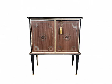 Particolare vetrina da salotto o da entrata dei primi anni '50 realizzata da Umberto Mascagni a Bologna / Italia. Mobile in ottime condizioni vista l'età, posizionabile fin da subito. All'interno ha un ripiano in vetro originale dell'epoca e uno schienale formato da tanti piccoli specchietti.