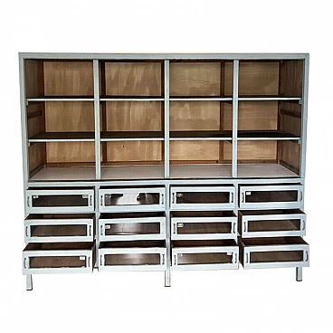 Pastaia anni '50 di grandi dimensioni in legno. Le parti frontali dei cassetti sono in vetro e legno, con doppia maniglia in metallo, di cui solo una mancante, come da foto. L'oggetto vintage presenta alcuni difetti e normali segni di usura, dovuti al tempo, come da foto. Altezza parte superiore: 121 cm Altezza parte inferiore: 105 cm