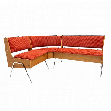 Set da pranzo angolare di metà secolo, realizzato nell'ex Cecoslovacchia nel 1960. Include un set di sedute pieghevoli ad angolo, un tavolo da pranzo e due sedie. Questo set è realizzato in legno di faggio, compensato, tessuto e cromo. In generale è in ottime condizioni vintage, con segni di usura e di utilizzo come si può vedere nelle immagini. Divano: Larghezza: 168 cm Altezza: 76 cm Profondità: 130 cm Altezza seduta: 46 cm Tavolo: Larghezza: 90 cm Altezza: 73 cm Profondità: 60 cm Sedia: Larghezza: 37 cm Altezza: 84 cm Profondità: 42 cm Altezza seduta: 42 cm