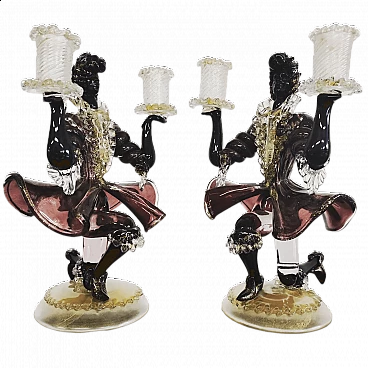 Coppia di candelieri in vetro di Murano dalle fattezze di due mori. Gli oggetti sono in perfette condizioni, creati utilizzando varie tecniche quali l'avventurina ,il vetro sommerso e il vetro oro.