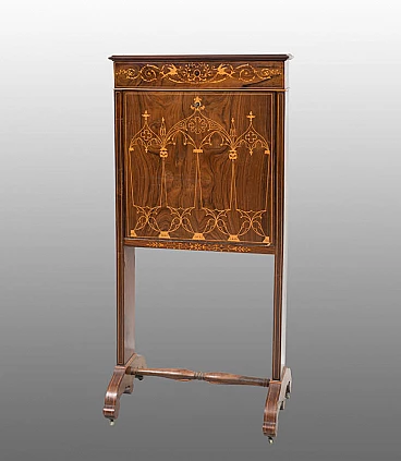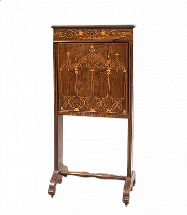 Secretaire Carlo X in legno esotico pregiato con innesti di intarsio in acero. La parte superiore è composta da una calatoia celante una zona a giorno pensata come un vano arcuato portalettere e parte sottostante scomparti porta inchiostro. Il piano calatoio è rivestito con strato in pelle bordato da elegante fregio a fuoco. Il corpo inferiore, molto più semplice nella sua costruzione, è composto da due piedi terminante con una solida base. Gli interni sono in acero e conservano ancora chiavi e serrature originali dell'epoca. Il piano è reclinabile ed è facilmente utilizzato come vano portaoggetti. Il mobile è in eccellente stato di conservazione e accompagnato da certificato d'autenticità.