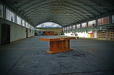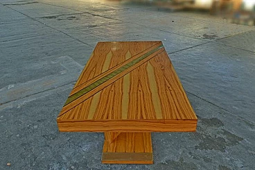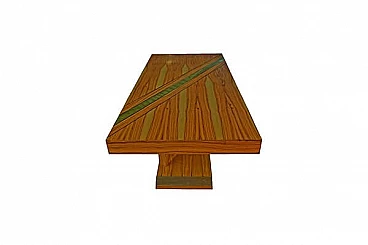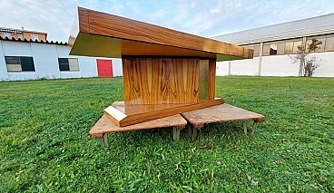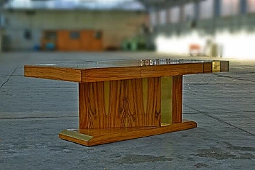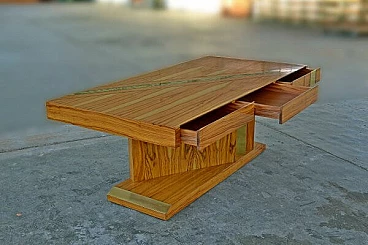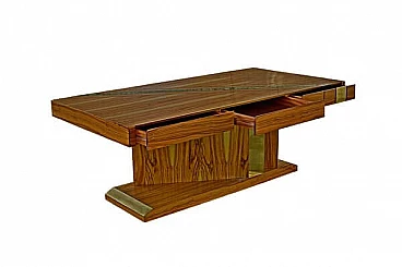 Tavolo scultoreo in radica di ulivo e ottone con tre cassetti, anni '50