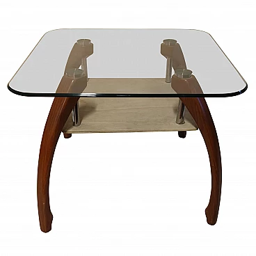 Tavolino da salotto con piano in cristallo e gambe curve in faggio. Ripiano in legno al naturale.