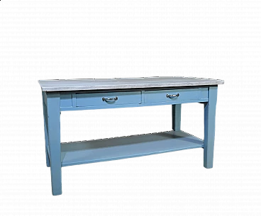Tavolo da cucina in legno con ripiano in marmo. Il tavolo ha due cassetti sul lato lungo, profondi quanto il tavolo stesso. Lo stile è quello classico delle cucine anni '40 e '50. Il marmo è quello originale, pertanto presenta qualche segno del tempo, ma in generale è in buone condizioni vintage (vedi foto). Ottimo come piano di lavoro o tavolo da pranzo.