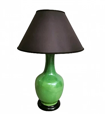 Lampada francese in ceramica e base rotonda in legno laccato nero; la caratteristica principale di questo oggetto è la lavorazione artigianale della ceramica con effetto "craquelé"; la parte in terracotta è stata creata con un procedimento originale e antico: il pezzo di terracotta grezza è stato prima modellato nella sua forma finale, morbida ed elegante, poi è stato cotto a circa 1000°, quindi è stato utilizzato un prodotto screpolante per creare le fessure, a questo punto è stata utilizzata l'antica tecnica della smaltatura a immersione in smalto verde trasparente; la fase di smaltatura richiede una grande abilità, in quanto è importante che lo smalto si depositi uniformemente sulla superficie dell'oggetto, in modo da far emergere e non coprire le fessure sottostanti; è stata poi effettuata una seconda cottura per fissare definitivamente la tinta; all'oggetto finito è stata applicata la base in legno laccato nero ed è stato realizzato l'impianto elettrico. La lampada è stata realizzata tra il 1920 e il 1925 in un laboratorio artigianale di Tours, nel dipartimento dell'Indre et Loire, dove si trovava la famosa e antica fabbrica Sainte-Radegonde, specializzata e famosa proprio per l'eccellente produzione di terracotta smaltata.