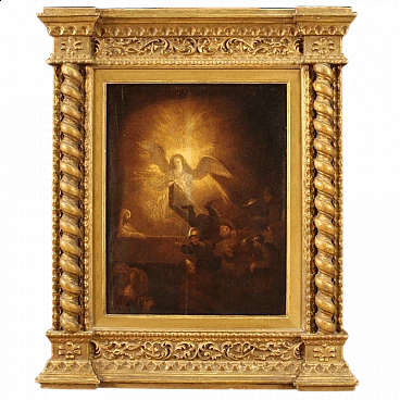 Dipinto religioso del XIX secolo, la resurrezione di Cristo. Quadro ad olio su tavola che raffigura alla maniera di Rembrandt uno dei suoi dipinti più famosi. A sua volta il grande pittore olandese si era ispirato per questa composizione all'Assunzione di Maria Vergine di Tiziano. La controriforma aveva ridefinito l'iconografia e bisognava attenersi alla lettera alle sacre scritture: Gesù verrà assunto in cielo 40 giorni dopo la sua morte, per questo i due momenti, resurrezione e ascensione, non vanno confusi e devono essere rappresentati singolarmente. L'Angelo appare improvvisamente nel mezzo della luce divina e solleva la pesante pietra del sepolcro. La reazione dei soldati di fronte al miracolo è di timore e paura, e questa fuga disordinata conferisce dinamicità al dipinto. La vera protagonista però è la luce opposta alle profondità delle tenebre. Cornice del XX secolo in legno scolpito e dorato di bella decorazione. Quadro che ha subito un intervento di restauro conservativo, palchettatura (vedi foto retro) e ripresa del colore in alcuni punti. Opera in buono stato conservativo, con alcuni segni del tempo. Luce dipinto H 54 x L 42 cm