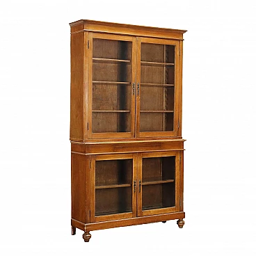 Libreria a doppio corpo impiallacciata in mogano con alzata e corpo sposate, dotate entrambe di coppia di ante in vetro soffiato, rastrelliera, leggio estraibile sottopiano e piedi a trottola. Gli interni sono in abete.