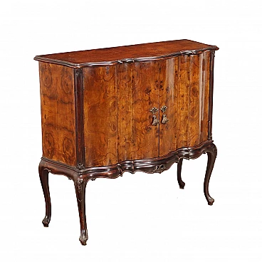 Mobile bar in Stile Chippendale impiallacciato in radica di noce con interni a specchio, ripiani in vetro e maniglie in bronzo brunito.