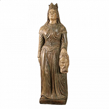 Grande scultura in terracotta italiana degli inizi del XX secolo. Opera finemente cesellata e dipinta raffigurante soggetto biblico Giuditta e Oloferne. Scultura di eccezionale misura e impatto per antiquari, arredatori e collezionisti di sculture a tema religioso. Opera di grande carattere, finita da centro, con un foro posto sul retro e un altro sotto la base (vedi foto). Scultura di linea e stile tardo gotico, Giuditta raffigurata con spada nella mano destra e la testa di Oloferne nella sinistra (vedi foto). Opera che ha subito qualche piccolo intervento di restauro conservativo sulla corona (vedi foto) e la riparazione di una fessura nella parte inferiore del retro. Scultura nel complesso in bella patina e in buono stato conservativo.