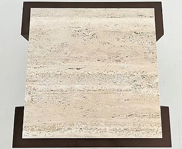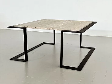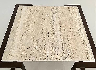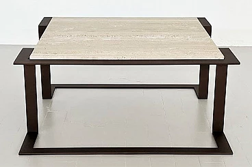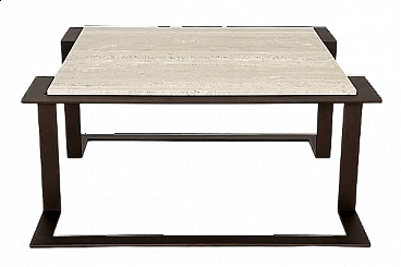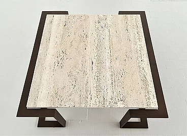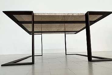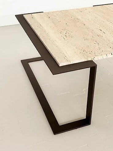 Il tavolo ha una base in ferro battuto fatta a mano che è stata levigata e verniciata con lacca Corten (dando al ferro un effetto "arrugginito") e un bellissimo piano in marmo Travertin antico.