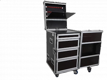 Flight case prodotto da Bauhaus Boh in legno compresso e laminato di faggio Maniglie e accessori in alluminio. Con 4 cassetti 1 portaattrezzi e Vano con 2 scomparti. Coperchio e porta apribile. Ruote funzionanti dotate di sistema di bloccaggio. Dotato di 3 chiavi per chiusura porta anteriore e laterale. In buone condizioni con qualche difetto dovuto all’uso.