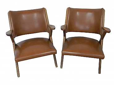 Bella coppia di poltroncine di produzione italiana, ditta Dal Vera, anni '50, con struttura in legno dolce e schienale ricurvo, rivestite in similpelle marrone.