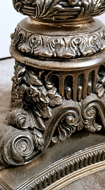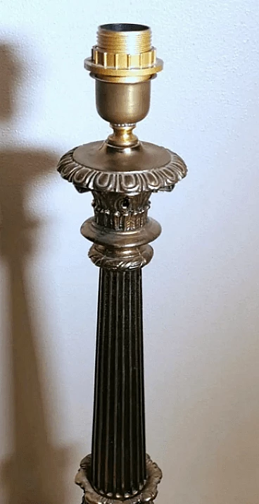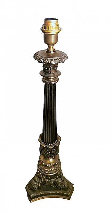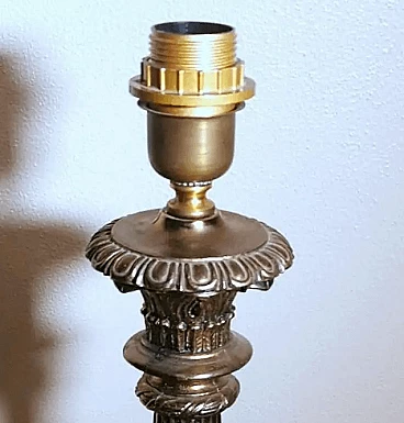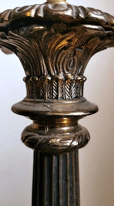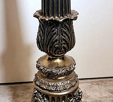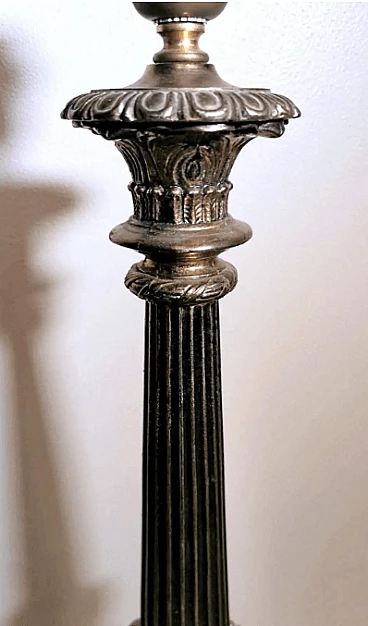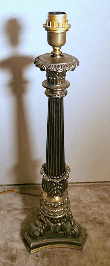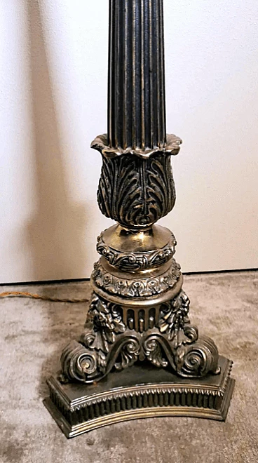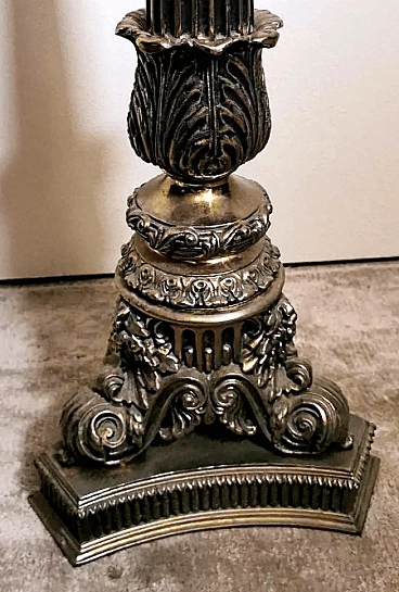 Candeliere in stile impero, elettrificato per funzionare come lampada da terra; è stato realizzato tra il 1950 e il 1955 da una bottega artigiana di Firenze e fu realizzato su commissione per una famiglia nobile della città, quindi mai messo in commercio. Nasce dalla collaborazione tra la bottega artigiana e un'importante e antica fonderia d'arte nei pressi di Firenze; l'artigiano disegnò i diversi pezzi del candeliere ispirandosi a un ricco ed elegante stile Impero, poi consegnò il progetto alla fonderia, che realizzò le forme e fuse i componenti in ottone con la competenza e la passione di una generazione di artisti fonditori. Infatti, in questa fonderia, dall'antico sapore rinascimentale, si respira l'alta artigianalità del laboratorio dove le opere nascono in un magico susseguirsi di forme, materiali e colori. I pezzi finiti venivano riconsegnati all'abile artigiano fiorentino che li cesellava in modo accurato e minuzioso in modo da far risaltare anche i più piccoli dettagli; tutti gli elementi venivano poi dorati con una doratura a bagno galvanico di ottima qualità; l'artigiano, prima di assemblare definitivamente tutti gli elementi, spennellava un acido brunitoio per antichizzare la superficie dell'ottone, che nel tempo ha poi formato anche una patina originale rendendo oggi questo oggetto ancora più prezioso ed esteticamente coinvolgente.