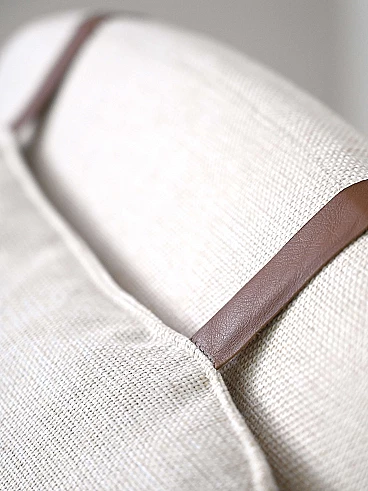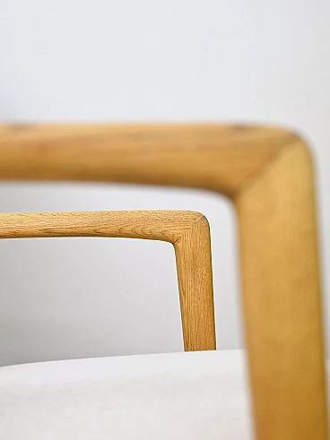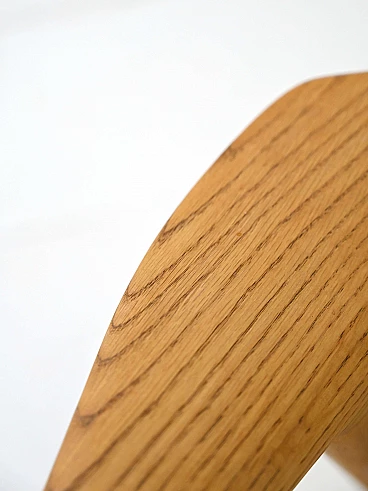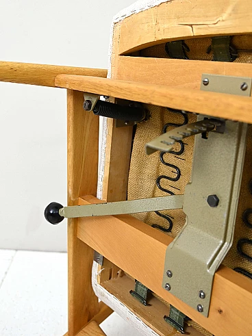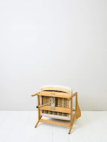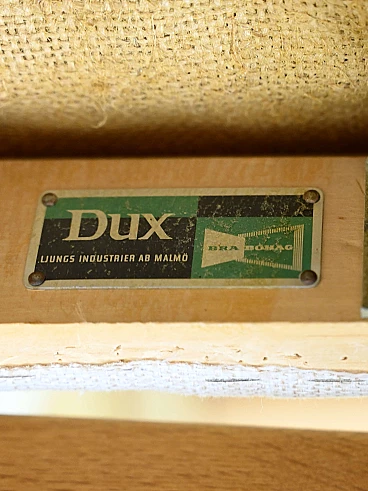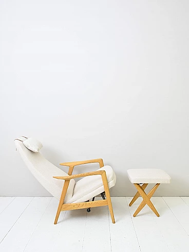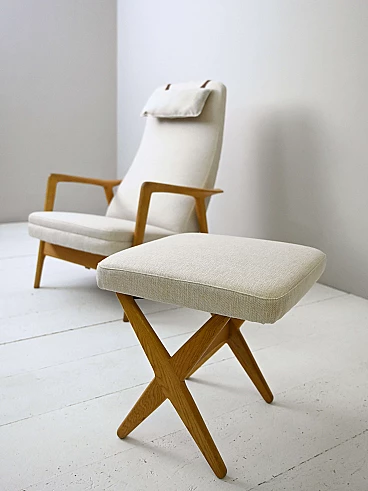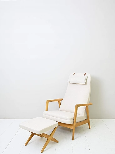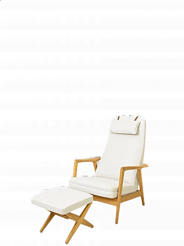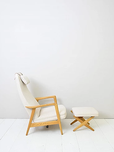 Poltrona con schienale alto disegnata da Alf Svensson e prodotta dall’azienda DUX negli anni ‘50. La sedia dal design accattivante, ha una solida struttura in rovere mentre la seduta è stata restaurata sostituendo l’imbottitura e il tessuto. Utilizzando la leva laterale, questa poltrona può essere bloccata in posizione eretta o reclinata, oppure, se sbloccata, utilizzata come dondolo. La sedia viene venduta con il poggiapiedi originale disegnato da Alf Svensson che può essere posizionato a due differenti altezze. Seduta L56cm, H38cm, P46cm - Poggiapiedi: L43cm, H34cm/44cm, P42cm. Ottime condizioni per la sua epoca.