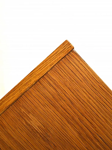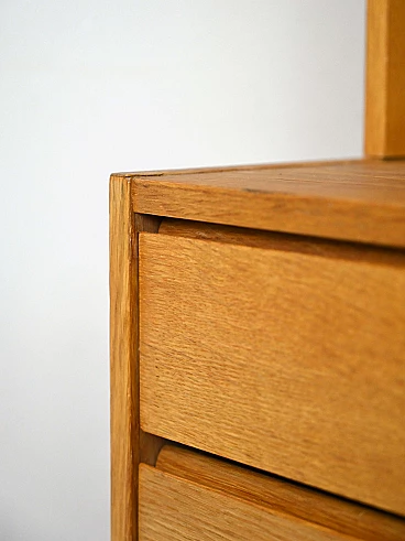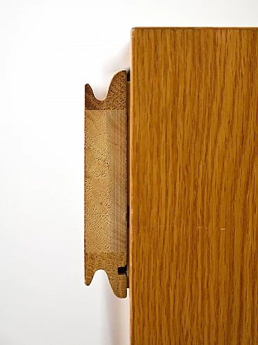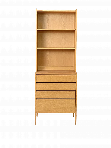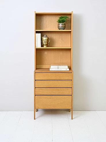 Mobile libreria in legno di rovere con cassettiera moderna indipendente con 4 cassetti. Una soluzione multifunzione per chi cerca dei ripiani dove riporre libri ed altri oggetti da esporre, ma anche per nascondere ciò che non si vuole tenere in vista. Questo mobile moderno dalle linee nordiche retrò è formato da una parte alta che presenta tre scaffalature regolabili in altezza e da una parte bassa che è una vera e propria cassettiera che può essere utilizzata anche senza la libreria. La particolarità, che richiama le linee nordiche di metà secolo, consiste nell’impugnatura in legno curvato dei cassetti. Grazie alle piccole dimensioni e all’eleganza minimale e senza tempo, questo mobile è adatto per la camera da letto, il soggiorno e l’ingresso. Buone condizioni. É stato fatto un restauro conservativo. Per piacere presta attenzione alle fotografie.