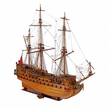 Modellino di vascello in legno costruito a mano. Oggetto in buone condizioni, presenta piccoli segni di usura.