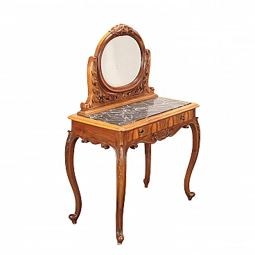 Toilette in stile Chippendale in noce massello impiallacciato noce, Italia inizio XX secolo. Alzata intagliata a elementi fogliacei e dotata di specchio molato basculante, piano in marmo, cassetto nella fascia, gambe mosse. Interni in mogano.