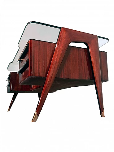 Questo splendido e suggestivo scrivania da ufficio è uno dei capolavori del designer italiano Vittorio Dassi, un modello prodotto in Italia negli anni Cinquanta e dedicato ad un pubblico formato da professionisti e dirigenti. La sua struttura in palissandro è caratterizzata da una forma scultorea, con gambe affusolate rifinite con sabot in ottone, dotata di quattro cassetti tutti bloccabili e dotata di un tavolo galleggiante con piano in vetro di forte spessore dalla forma leggermente curva. E' in buone condizioni dell'epoca, è stato restaurato di recente ed è pronto all'uso.