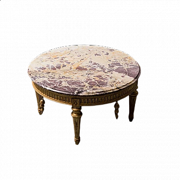 Tavolino da caffè anni’50. Struttura in legno foglia oro. Base in marmo. Buone condizioni, presenta segni del tempo. Design anni ’50.