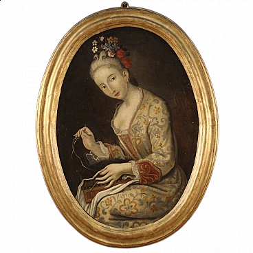 Antico dipinto italiano del XVIII secolo. Opera olio su tela raffigurante ritratto di nobildonna che cuce di buona mano pittorica. Cornice non coeva scolpita, dorata e adattata al dipinto, di bella decorazione. Quadro di buona misura e impatto, fanciulla elegantemente dipinta nei minimi particolari del vestito e dell'acconciatura floreale (vedi foto). Opera che ha subito un intervento di restauro conservativo, rintelo, sostituzione del telaio e ripresa del colore in diversi punti (vedi foto). Quadro nel complesso in buono stato conservativo con qualche segno del restauro. Luce dipinto H 79 x L 56 cm.