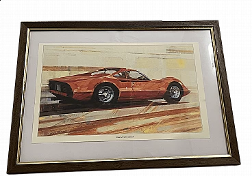 Litografia Ferrari Dino berlinetta speciale del pittore inglese Dexter Brown (1942) celebre per i suoi dipinti di auto da corsa. Esemplare unico presentato nel 1965, questa berlinetta anticipa in molte soluzioni la linea della successiva Dino 206 Gt. Il motore derivato da quello della barchetta 206P, era un V6 di 1.986 cc montato in posizione centrale ed erogante 205 Cv.