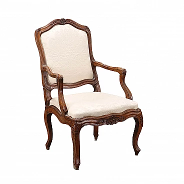 Poltrona di periodo Barocchetto risalente alla metà del '700. Tutta la struttura in noce è sagomata con gambe e braccioli mossi, le tipiche modanature rifiniscono i contorni abbelliti da intagli tipici con conchiglie e motivi floreali. Seduta e schienale amovibili. Mobile in buone condizioni, presenta piccoli segni di usura.
